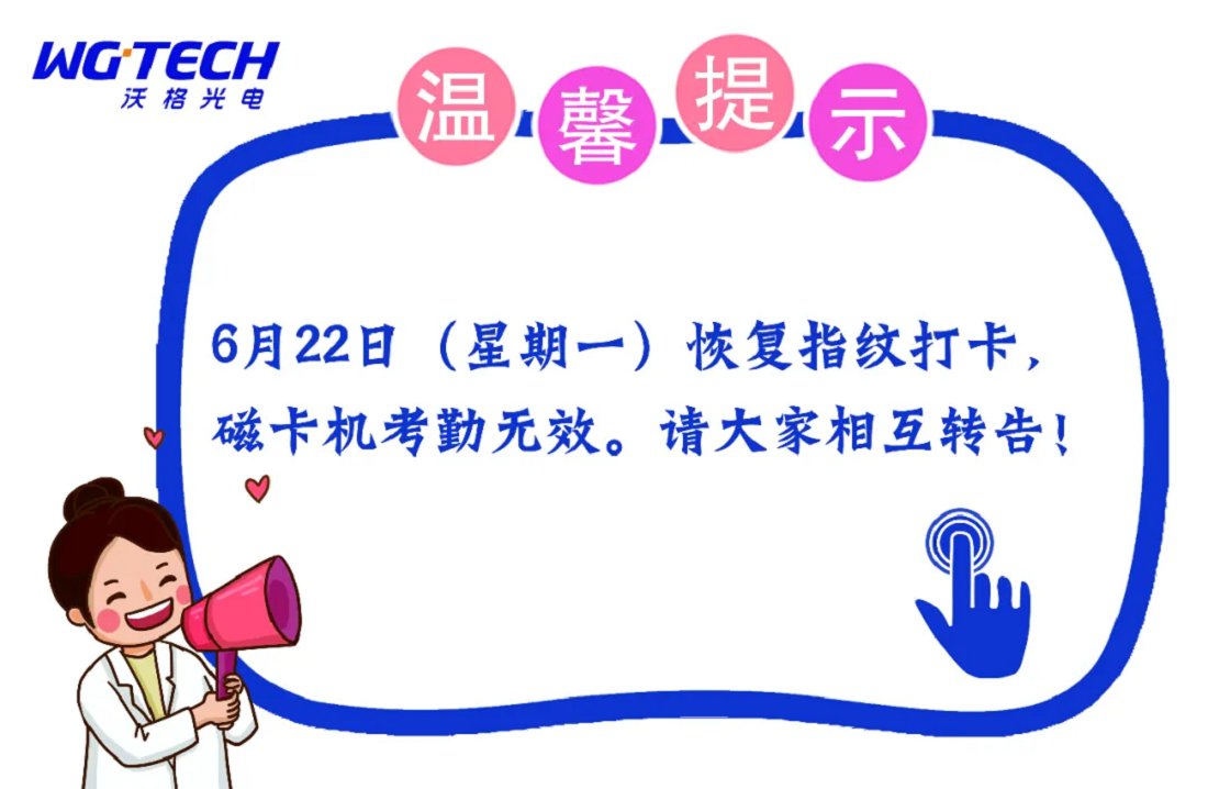 Everybody, move the bench and sit down! (cough) since Monday, June 22, the fingerprint clock that has been away for a long time has finally come back! With a little finger, the sound of "beep" is familiar. It means our life is getting on the right track. So, my friends, don't use IC card to punch cards. We have posted the punch card notice in all punch card areas and publicity platforms of the company. Let's hurry up!