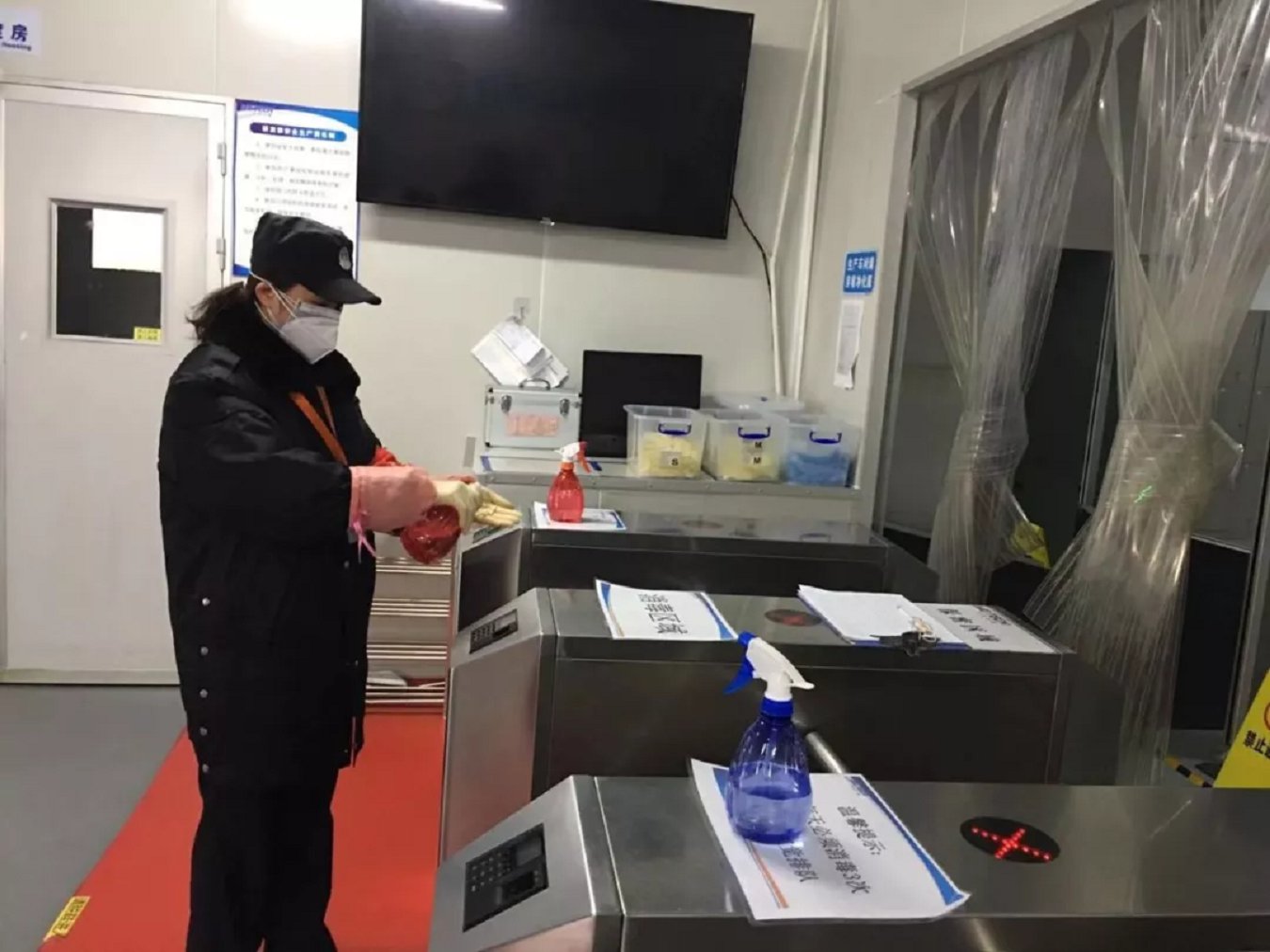 车间内人数众多,把好车间出入口至关重要。在既有人员进出管控的基础上,车间入口处配备了消毒酒精、免洗洗手液等防疫物品,加强人员卫生消毒。