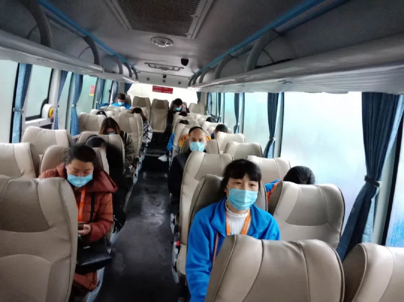 为保障员工的人身安全,公司对复工人员实行统一住宿管理。员工上下班专车接送,隔位落座,守好员工回“家”路。同时员工还可通过“投诉建议平台”反映困难及需求,责任部门保证迅速响应。