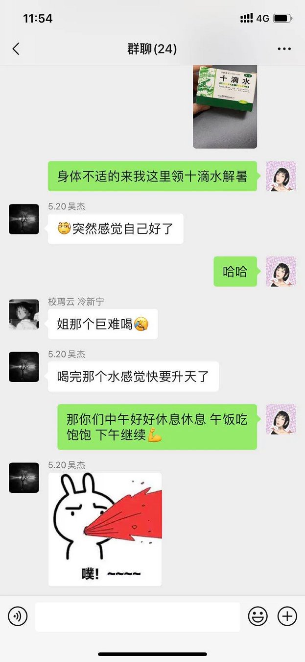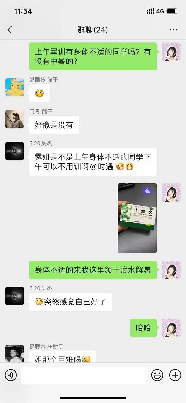 7月15日,整队军训,犹如新生入校,头一课就是军训。军姿、队列、步伐,有过“经验”的大学生们,面对着“太阳顶头照”,免不了“大汗渗肤流”,一上午的训练结束,就有些“种子”蔫吧了,抱着侥幸心理想逃脱军训的心被一支“十滴水”治愈了O(∩_∩)O哈哈~(后续的拓展将更加精彩~)
