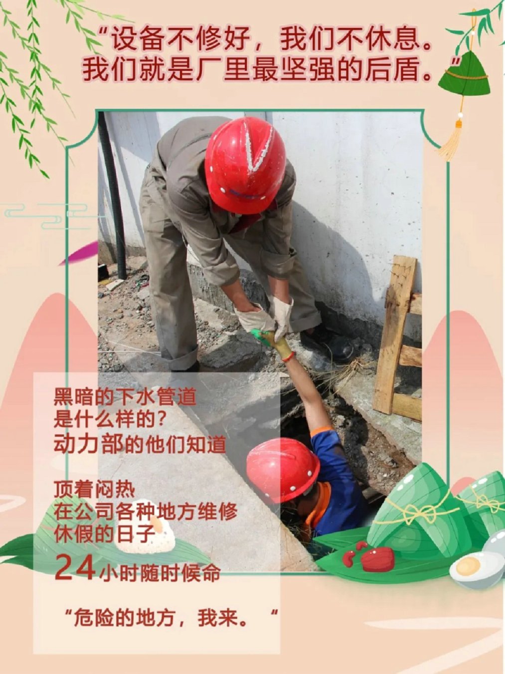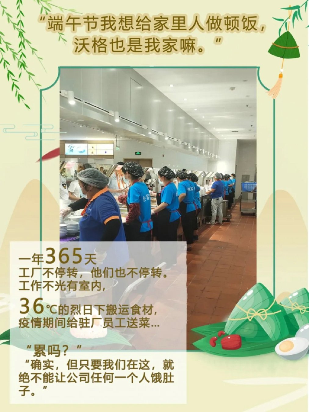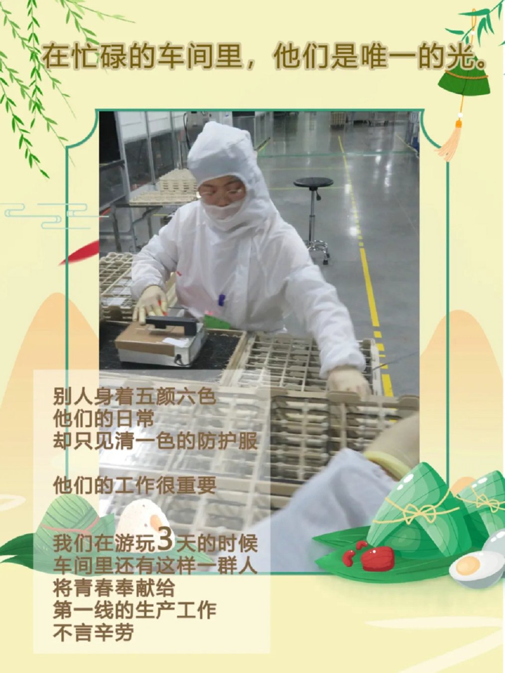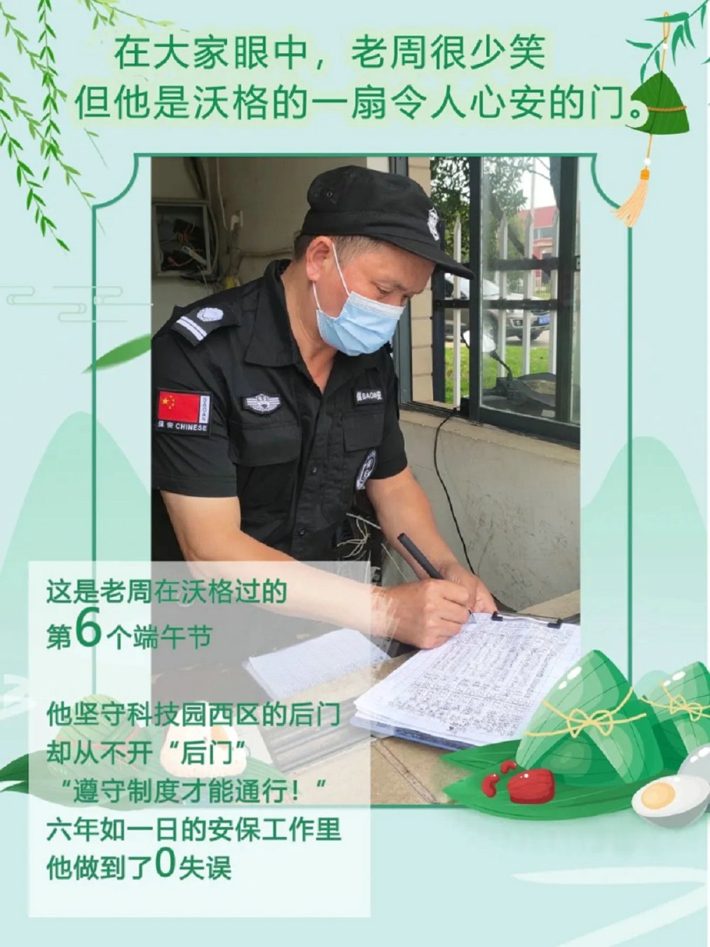 端午“沃”在岗,坚守岗位的你们,了不起! 发布时间:2021-06-17 五月初五,粽叶飘香 端午节 对于大部分人来说 是与家人团聚,一起出行的美好时刻 盛夏的日子里度过这样一个小长假 也显得格外惬意 然而,沃格仍有这样一群人 他们没有在家享受假期 而是在烈日炎炎里 依然默默坚守岗位 不舍昼夜,风雨无阻 不光是上面出现的各位沃格人 小沃在走访过程中 没有拍下来的 还有很多很多 也许此时在看文章的你,也因为调休 因为沃格的需要 而选择在端午节的三天假期里 留在公司 奋斗在自己的岗位上 你们都是最了不起的沃格人 小沃也在这里 向你们致敬!