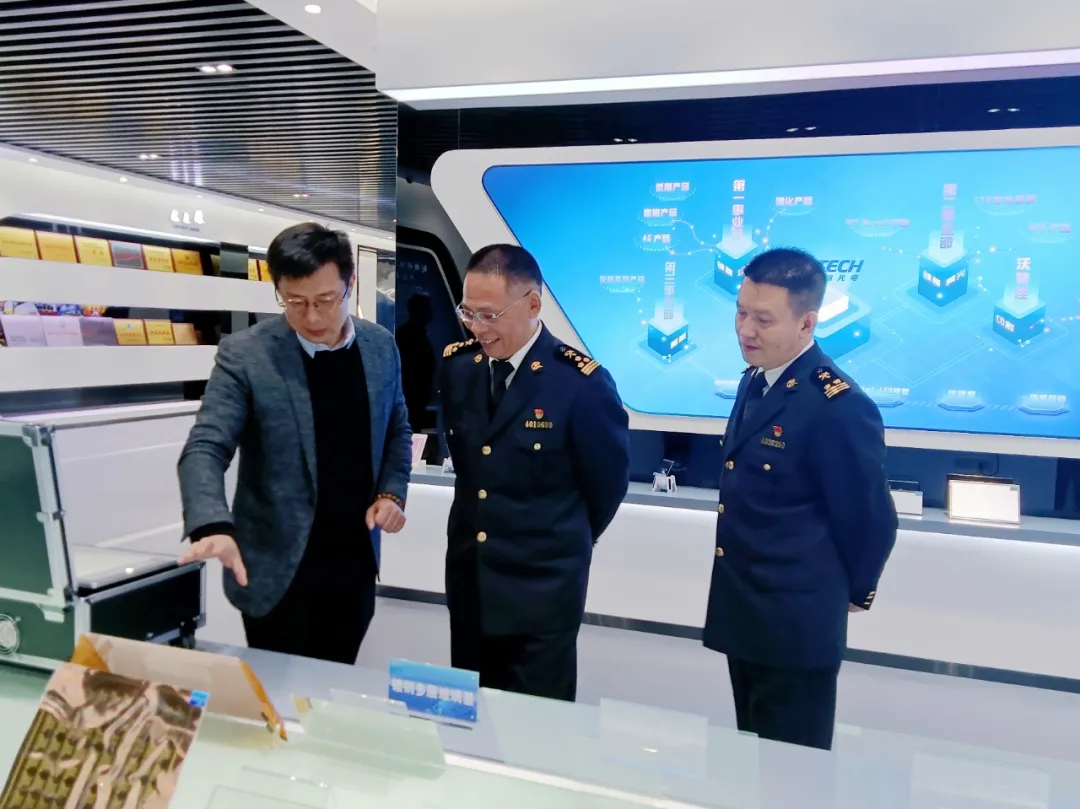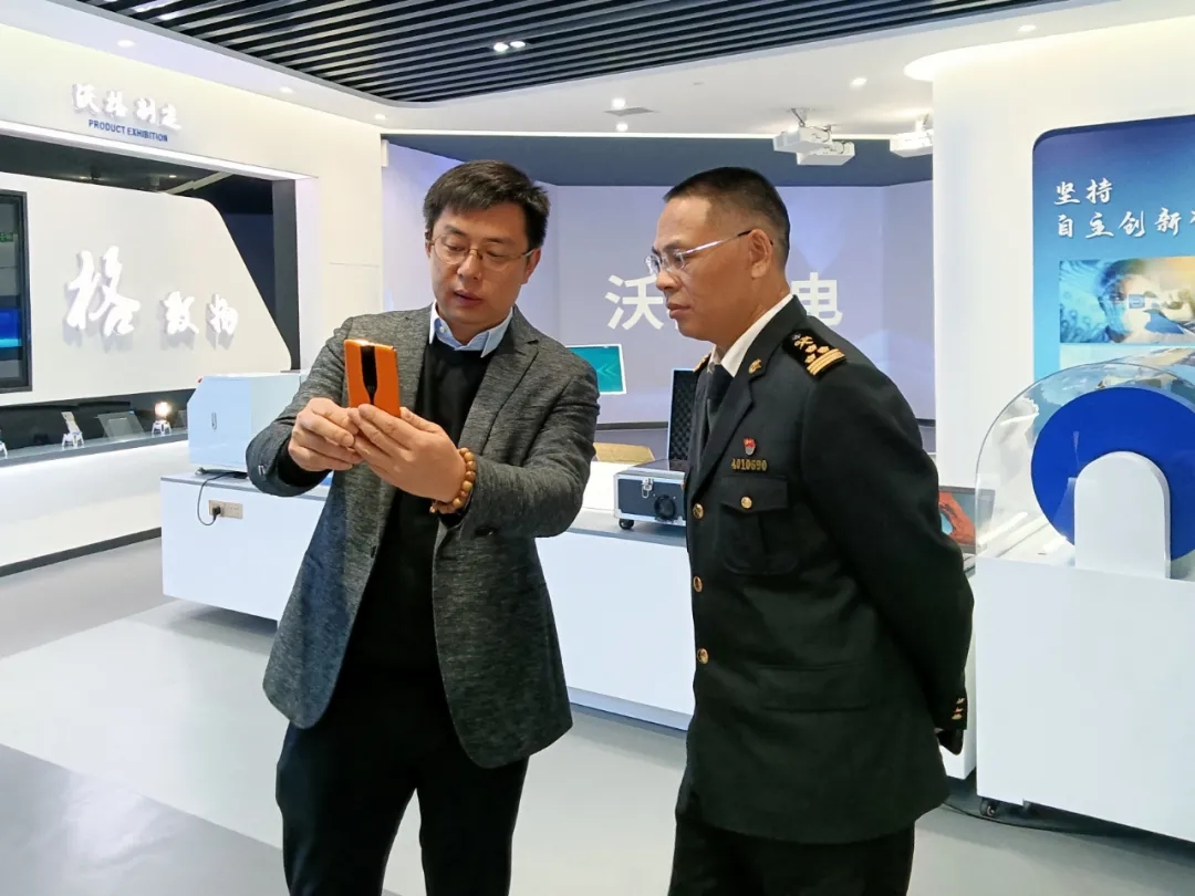 沃格光电董事长易伟华为新余海关关长程远介绍展品